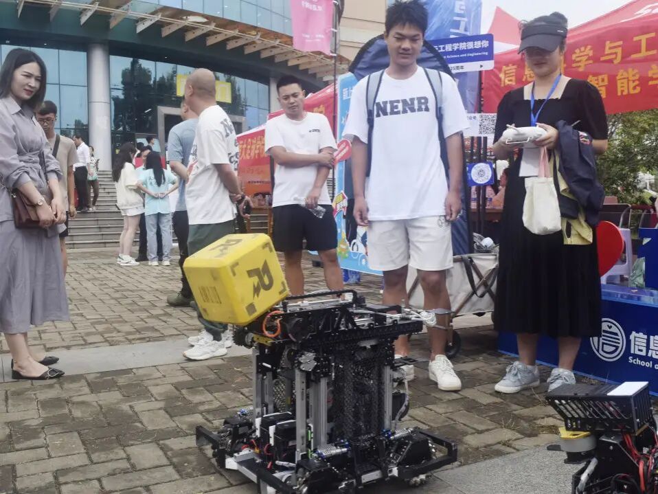 14日,崇實(shí)戰隊的隊員們攜帶兩臺智能小車(chē)以及一臺無(wú)人機來(lái)到了帳篷迎新點(diǎn),以其科技產(chǎn)品豐富的科技感、炫酷感吸引了眾多新生駐足觀(guān)看。復雜精妙的機械通過(guò)有序的設計與算法控制集合成功能外觀(guān)一流的小車(chē)吸引了新生們想要躍躍一試,崇實(shí)戰隊的隊員王翔躍便隨機邀請了集團新生進(jìn)行實(shí)際操作,引導他們通過(guò)手中的遙控器指引小車(chē)進(jìn)行加速、推物、翻轉等動(dòng)作。獨特的造型與特技的動(dòng)作也引得家長(cháng)們舉起手機紛紛錄制視頻。