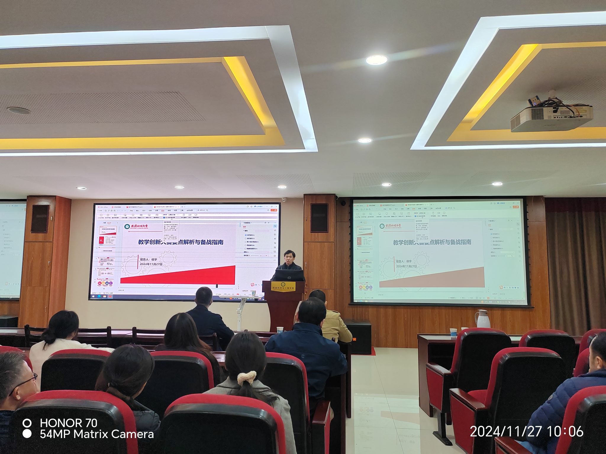 為迎接教學(xué)創(chuàng )新大賽,提升教師教學(xué)能力,提高教學(xué)創(chuàng )新水平,11月27日,學(xué)院特邀請全國教學(xué)創(chuàng )新大賽一等獎獲得者、機械學(xué)院侯宇教授做《教學(xué)創(chuàng )新大賽要點(diǎn)解析與備戰指南》專(zhuān)題培訓,學(xué)院黨委書(shū)記冒穎、40名教師參加培訓,培訓由學(xué)院副院長(cháng)程磊主持。