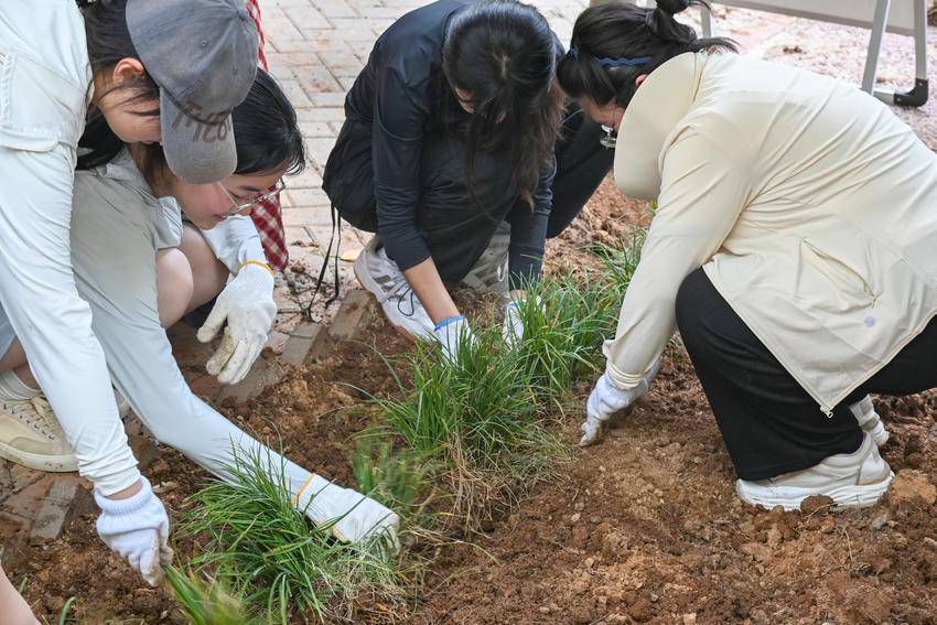 解決好人選,團隊遇到的最大問(wèn)題是松土,常年無(wú)人打理的荒地,有很多板結的土塊和雜草。天氣炎熱,花土堅硬,學(xué)生們費了很大力氣鏟苗,汗水已經(jīng)浸透幾位學(xué)生的衣服,也讓他們在實(shí)踐中掌握了自己的門(mén)道:“用腳用力踩住鐵鍬,當鐵鍬深入土后,再翻轉,可以很好的翻出板結的土塊?!?/span>