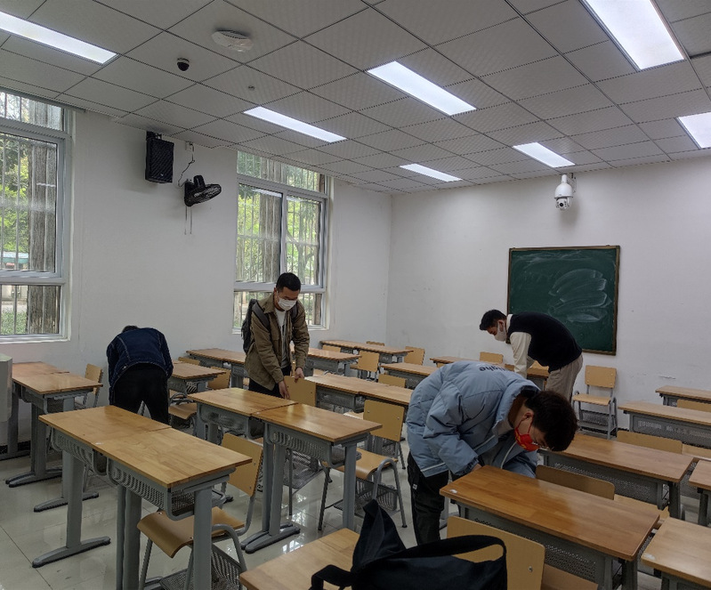 我們對教三樓各個(gè)教室進(jìn)行了查看,發(fā)現許多教室存在桌椅擺放不規整,課桌內還留有部分垃圾。為此我們將成員分成了四組對每一層樓進(jìn)行清理,每一組中一人負責教室抽屜垃圾處理、兩人負責課桌椅擺放、還有一人負責黑板擦拭等工作。組內成員的積極性很高,在大家的互幫互助下,經(jīng)過(guò)一上午的處理,各個(gè)教室的衛生環(huán)境得到了改善。