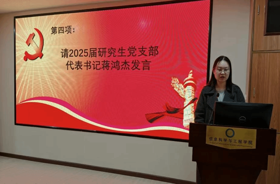 電子信息學(xué)院2025屆研究生黨支部代表書(shū)記蔣鴻杰發(fā)言。她提出了新一屆黨支部的工作計劃和目標,強調將圍繞學(xué)校和學(xué)院的中心工作,進(jìn)一步加強黨支部的組織建設和思想建設。蔣鴻杰提到,新一屆黨支部將注重黨員的培養和發(fā)展,通過(guò)開(kāi)展專(zhuān)題講座、交流研討等活動(dòng),提升黨員的綜合素質(zhì)和業(yè)務(wù)能力;同時(shí),將積極探索創(chuàng )新黨建工作模式,開(kāi)展具有特色的黨建活動(dòng),增強黨支部的吸引力和影響力。她還表示,新一屆黨支部將更加注重服務(wù)同學(xué),積極為同學(xué)們辦實(shí)事、解難題,努力使黨支部成為同學(xué)們的堅強后盾。蔣鴻杰最后表示,新一屆黨支部將團結帶領(lǐng)全體黨員,以更加飽滿(mǎn)的熱情和昂揚的斗志,為推動(dòng)黨支部的發(fā)展和學(xué)校學(xué)院的建設貢獻自己的力量。
